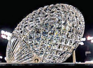 - #1 will play #4, and #2 will play #3 on December 31 and/or January 1. Winners will advance to the championship game on the first Monday in January, or January 12, 2015 for the FIRST national championship game. Mark your calendars NOW! I really like only four teams in a playoff, but what ranking system will be used for selecting these FINAL FOUR titans of college football each year? It was noted that criteria to be used will be won-loss record, strength of schedule, head-to-head results, and whether a team is a conference champion. What about any intangibles? The plan calls for the four teams to be selected by a committee, much like the way in which NCAA basketball championship tournament is conducted. Problem is THAT committee selects 64+ teams, whereas THIS committee must whittle 125 teams down to only FOUR. Also, you can bet that coaches and fans of at least #5 and #6 will NEVER stop their complaining….especially when they see the payouts. The only “progress” here is we’re substituting the subjectivity of a committee for convoluted BCS formulas. This committee has to make sure that the BEST four teams make it. Will that be possible every season? (Admittedly, the BCS system worked like a charm most seasons, but failed miserably a few others). This selection committee will receive more bribes than their IOC counterparts!